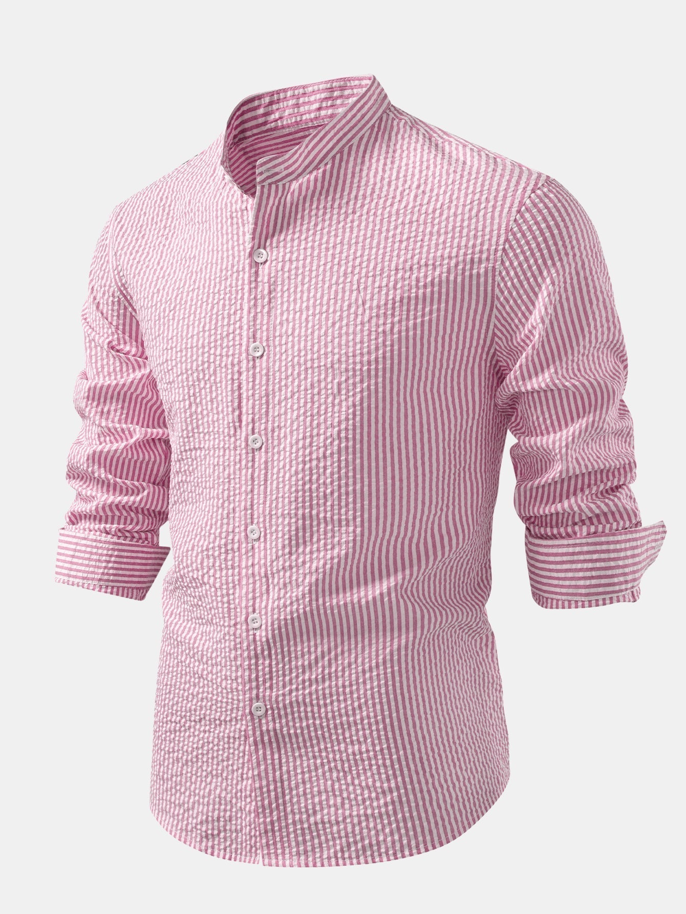 Elevate your everyday style with the clean and modern look of the striped stand collar button-up shirt. Featuring a minimalist stand collar and a vertical stripe design, this shirt combines a classic fit with a contemporary touch. Perfect for workdays, weekend outings, or layering under a jacket for a polished look.